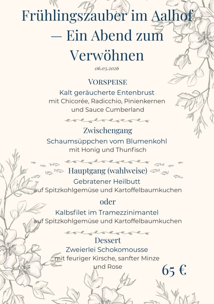 Unser Menüabend „Frühlingszauber“ lädt Sie ein zu einem Abend voller Leichtigkeit, feiner Aromen und liebevoll komponierter Gerichte.